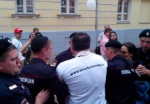 На театре Вахтангова активисты попытались вывесить баннер, он он застрял. После этого начались задержания. Около 20 человек полицейские отвели в заранее приготовленные автозаки. "Идите ловить бандитов", - кричали из автозака задержанные.