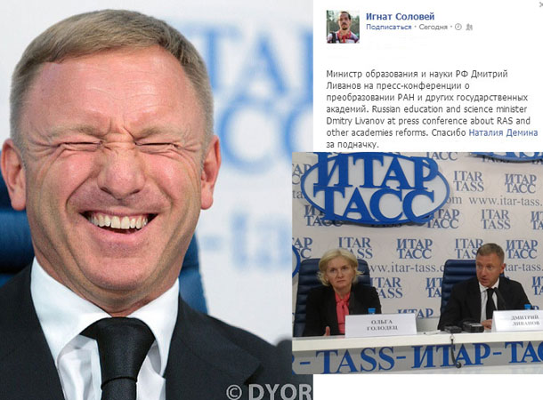 Эта фотография смеющегося Ливанова на пресс-конференции о реформе Академий наук, кажется, обошла весь Интернет Использованы фото И. Соловья и Н. Деминой Этой реформы ждали и не ждали. Пожалуй, всех успокоила объявленная Дмитрием Ливановым ставка на открытость, на намерение обсуждать все важные вопросы с Советом по науке и Общественным советом при МОН, как грянуло 27 июня 2013 года. «…Система управления этими структурами сложилась ещё в тридцатые-сороковые годы прошлого века …и, конечно, уже не в полной мере соответствует современным задачам развития страны. Эта система давно нуждается в обновлении…. Важно дать возможность учёным заниматься, прежде всего, наукой и исследованиями и избавить их от несвойственных функций управления имуществом и коммунальным хозяйством», –зазвучало с экранов телевизоров.