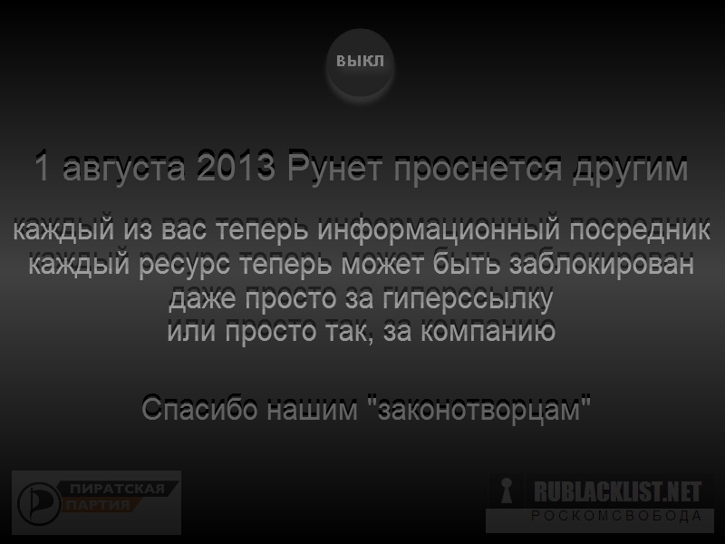 В качестве широкомасштабного донесения единой позиции интернет-отрасли и пользователей Сети мы предлагаем всем владельцам интернет-ресурсов 1 августа, в день вступления в силу одиозного закона устроить интернет-забастовку и показать наглядно каким может быть интернет в скором будущем в России, поставив чёрную заглушку на свой сайт с текстом-пояснением.