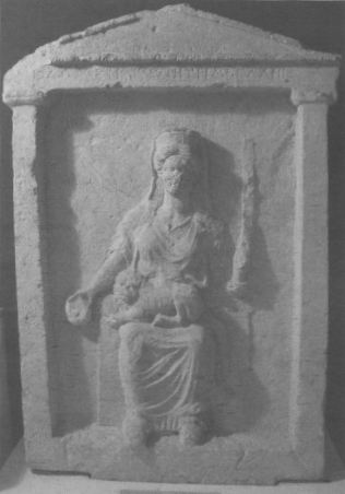 И атрибуты богини, и надпись позволяют безошибочно утверждать, что перед нами Кибела — богиня фригийского происхождения, культ которой распространился в восточном Средиземноморье, а в конце III века до нашей эры проник и в Рим. Львы возили колесницу богини, а тимпаны использовались в обрядах в ее честь. «Великая мать», «Мать Фригийская» или «Мать Богов» — частые эпитеты Кибелы.
