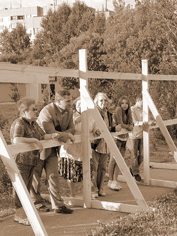 Это незнание, наверно, привело к тому, что ночью забор был частично уложен на бок. На строительном вагончике появилась надпись: «Стройте у себя во дворе». Кто-то решил испробовать иные способы достучаться.