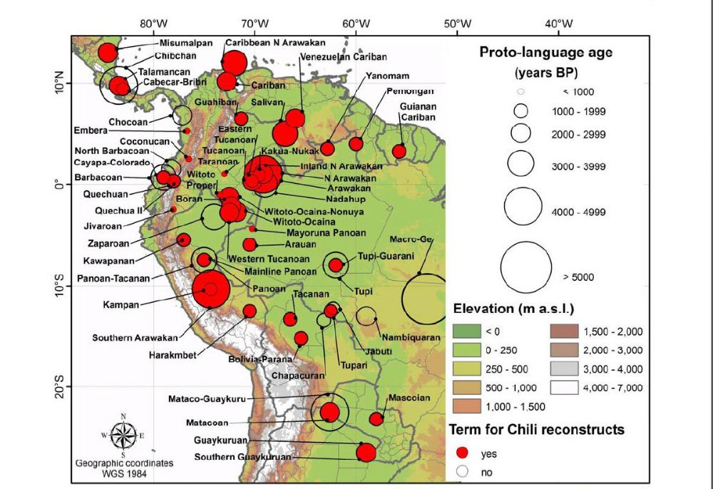 Языковые семьи Южной Америки, для которых реконструируется праязыковое название перца Предлагаемый метод основан на определении тех праязыковых семей, для которых удается реконструировать слова, обозначающие эти растения. Затем, используя специальные алгоритмы, ученые определяют время и место существования праязыков этих семей. Полученные реконструкции сопоставляются с данными генетических исследований культурных растений и археологическими находками.