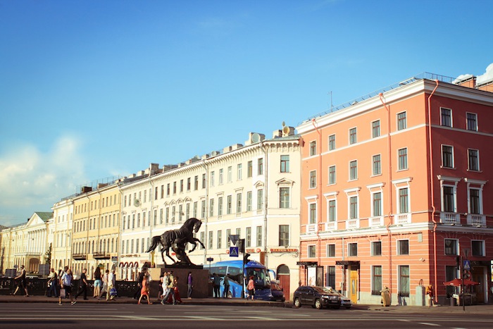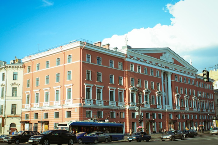 Фото: Никита Гранько / «Бумага» Первое изменение фасада по Невскому проспекту произошло в 1874 году, но о нем мы можем судить лишь по старым фотографиям. Дом сильно пострадал во время Великой Отечественной войны: еще в самом ее начале, в 1941-м, в него попала бомба, разрушив центральную часть здания. А при восстановлении оно заодно получило новый, более соответствующий времени фасад: с колоннами, фронтоном и скульптурами рабочего и колхозницы на крыше. Следующее приключение началось в 2010 году, когда при реконструкции под апартамент-отель здание, несмотря на многочисленные протесты градозащитников, разобрали целиком, а потом построили заново. Вот только ничего ужасного в процессе не случилось, а с виду новая постройка практически не отличается от оригинала — разве что выглядит не такой потрепанной.