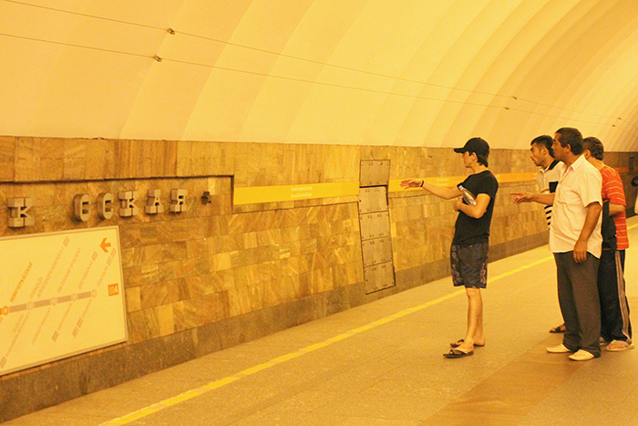 Фото дня: пассажиры метрополитена изучают название станции метро «Новочеркасская», написанное без одной буквы «а». В субботу букву обещали вернуть на место. В прошлый раз метрополитен менял буквы в названии станции в 2011 году — литера Ч была выполнена в иной гарнитуре по сравнению с остальными буквами.