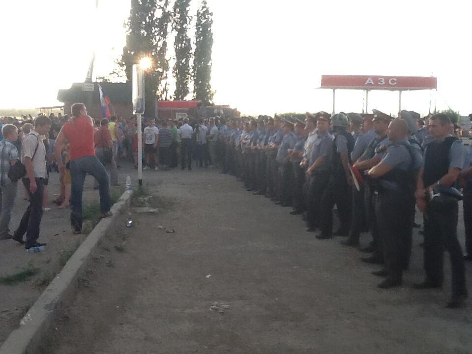 Полиция и ОМОН преградили путь демонстрантам, но жители прорвались через оцепление. Всего толпа прорвала два полицейских оцепления. Толпа движется по трассе в сторону Самары. Другая малая часть горожан вышла на трассу с другой стороны города.