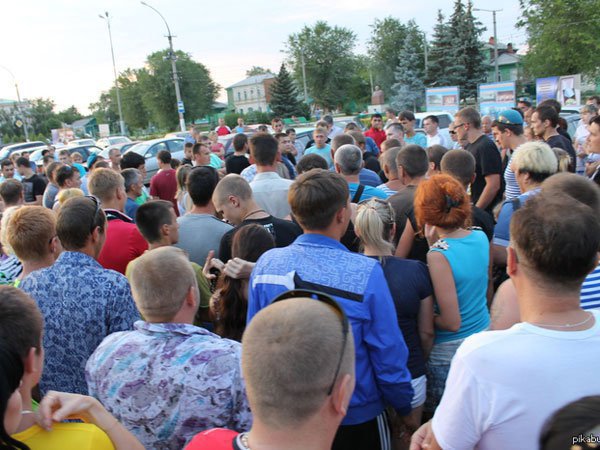 Митинг в Пугачеве Фото: pikabu.ru/ 8 июля от тысячи до полутора тысячи человек в Пугачеве Саратовской области вышли на стихийный митинг с требованием выселить из города чеченцев. Дело вчера дошло и до попыток перекрыть федеральную трассу, захватить здание администрации города и сжечь любимое выходцами с Кавказа кафе «Халяль». Люди были остановлены сотрудниками полиции, которые даже задержали одного из митингующих. Впрочем, ненадолго – под давлением требований вышедших на улицы людей задержанного отпустили.
