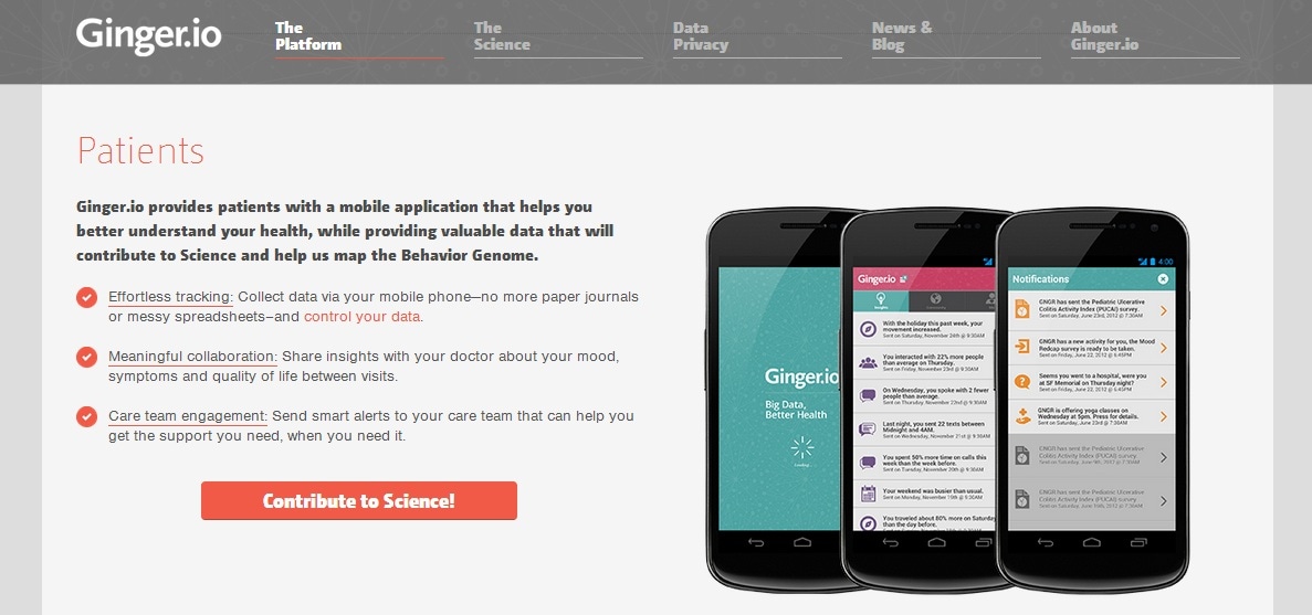 На этот раз исследователи обратились к сотовому телефону, неотъемлемому атрибуту социальной жизни, одному из главных инструментов для контакта с внешней средой. Центр медицинских исследований «MIT Media Lab» представил мобильное приложение «Ginger.io», которое отслеживает интенсивность звонков и сообщений, а также перемещения человека по различным локациям, сообщая лечащему врачу о потенциальной угрозе. Закономерность, положенная в основу приложения, проста чем выше социальная активность человека, тем меньше поводов для беспокойства. Если же на протяжении долгого времени он находится на одном месте, а круг общения ограничивается парой человек,существует определенный риск эмоционального расстройства, служащего главным катализатором развития болезни.