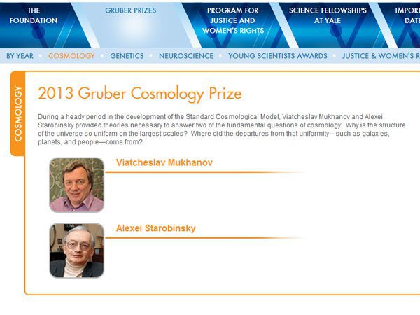 Вячеслав Муханов и Алексей Старобинский стали лауреатами премии Грубера по космологии за 2013 год за их вклад в создание стандартной космологической модели. Об этом говорится на сайте Фонда Грубера, присуждающего премию совместно с Йельским университетом.