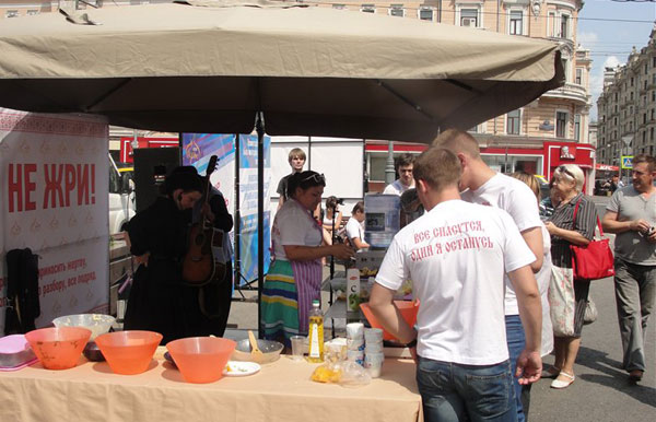 Акция «Православный F.A.Q.». Фото: Фото: anthony-bf.livejournal.com В общественном пространстве новый путинский комсомол в разных его формах неизбежно ассоциируется с церковью. Вероятно, дело в том, что вера, религия – это вещь сугубо личная, частная, и никто не может заставить людей думать иначе, пусть хоть толпа Кураевых и Чаплиных будет заклинать с амвона. А вот церковные собрания, службы, свечки – это социальная организация и идеология, т. е. политейя. Причем такая социальная организация, которую заказывает власть. Люди принимают этот заказ власти, идут в церковь, но при этом продолжают считать, что к вере, религии это имеет косвенное отношение. Поэтому и церковь, и нашисты находятся в плоскости одной социальной организации и одной идеологии – православного патриотизма.