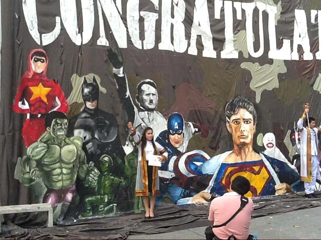 Университет Чулалонгкорн в Бангкоке выразил "глубокое сожаление" в связи с появлением гигантского полотна во всю стену, которое поступившие студенты представили на прошлой неделе в качестве традиционного прощания выпускникам. Под надписью по-английски "Поздравление" нарисован целый ряд популярных героев комиксов, таких как Супермен, Бэтмен, Железный человек, Невероятный Халк, Капитан Америка, а между ними "затесался" одиозный лидер немецкого национал-социализма.