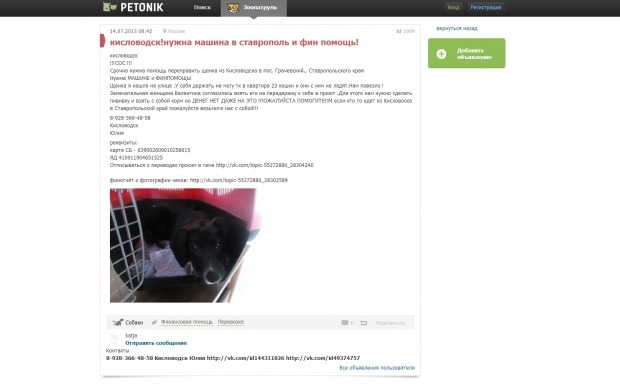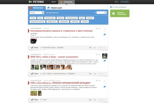 «Зоопатруль» — это новый раздел сайта «Petonik», в котором публикуются объявления о помощи животным — некоторые из них ищут дом, жизнь других висит на волоске. Чтобы поучаствовать в спасении, достаточно помочь с лекарствами или кормом, откликнувшись на сообщение, или разместить объявление в социальной сети.