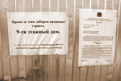 Объявления были размещены и на подъездах домов, и прямо на металлическом ограждении стройки: «Прямо за этим забором начинают строить 9-этажный дом. P. S. Общее собрание жильцов домов: Рижский проспект 85А и 87А 15 июля 2013 года в 19.00 на детской площадке».
