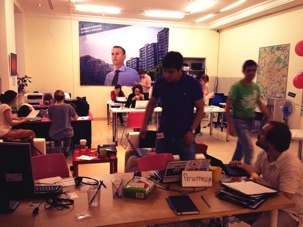 Штаб кандидата Навального разместился в большом светлом помещении на первом этаже старого дома №22 в Лялином переулке. Судя по большому зеркалу в пол, раньше здесь была парикмахерская. Теперь прямо напротив зеркала висит большой плакат с изображением кандидата в мэры от РПР-ПАРНАС, а все пространство заполнено столами, в подсобке хранятся стопки листовок и запчастями для агитационных кубов, а также много сосредоточенных штабистов и слегка растерянных новых волонтеров.
