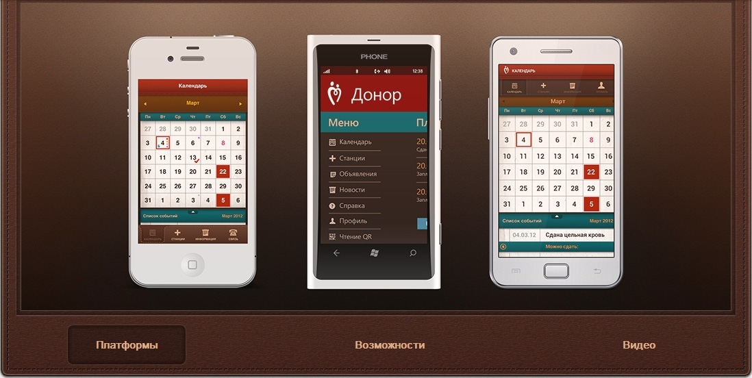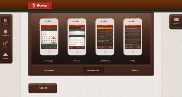Мобильное приложение «Донор» обеспечивает информационную и материальную поддержку доноров крови, привлекая пользователей к выполнению благородной гражданской обязанности. С помощью приложения пользователь может рассчитать приемлемую дату следующей кроводачи, узнать адреса пунктов приема, обменять виртуальные баллы на скидочные купоны и получить информацию о том, что его кровь пошла на конкретную операцию и помогла спасти чью-то жизнь.