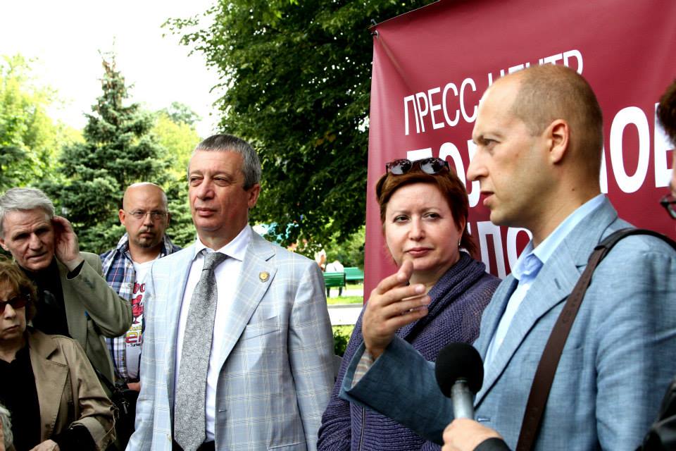 Ольга Романова, адвокаты Вадим Клювгант (слева) и Дмитрий Аграновский Накануне Московский городской суд перенес судебные слушания в другой, более просторный зал, оборудованный уже не одним, а двумя стеклянными "аквариумами", в которых на процессе находятся подсудимые. Однако, по словам адвоката Вадима Клювганта, работать с подзащитными защите проще не стало. К тому же, добавляет Ольга Романова, этот переезд никак не улучшил и условия содержания людей:
