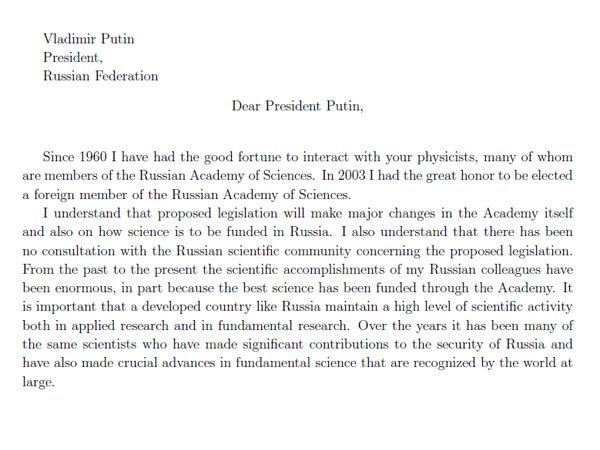 Письмо лауреата Нобелевской премии Джеймса У. Кронина президенту В. Путину о реформе РАН