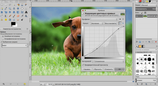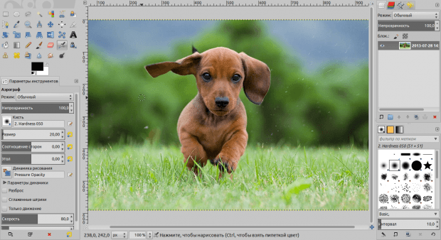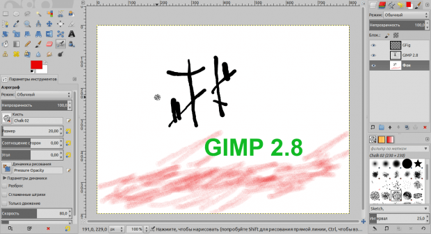 Для воплощения ваших самых смелых творческих фантазий GIMP предоставляет вам разнообразные инструменты рисования, в том числе кисть, карандаш, аэрограф, каллиграфическое перо, заливку, градиент, ластик и так далее. Обратите внимание, что в GIMP возможно устанавливать свои наборы кистей, которых можно найти в сети огромное количество, расширяя тем самым его возможности до бесконечности. А с помощью специальных плагинов, реализующих ту или иную необходимую функцию в виде отдельного приложения, работающего в оболочке графического редактора, можно настроить GIMP для выполнения таких серьезных профессиональных задач, как создание логотипов, векторных иллюстраций, сложных интерфейсных элементов в веб-дизайне и многого другого.