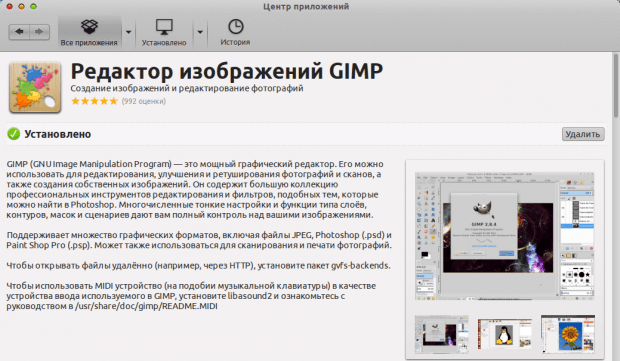 На момент написания статьи самой последней версией программы является GIMP 2.8, скачать который можно с официального сайта. Пользователи ОС Ubuntu могут, кроме этого, воспользоваться встроенным Центором приложений и установить программу с его помощью.