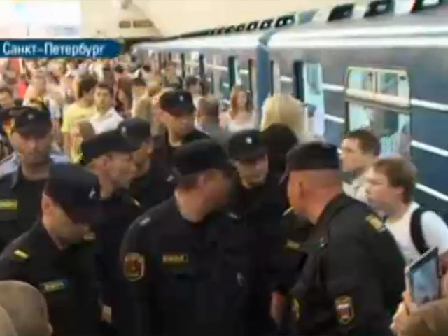 Кадры задержания националистов на станции метро "Сенная площадь" публикует телекомпания "Мир24". На них тоже фигурирует блондинка, у которой из рюкзака торчит бейсбольная бита. Другой активист был одет в футболку с символом, напоминающим эмблему "Русского национального единства" (члены этой организации были осуждены за тяжкие преступления, в том числе за убийства).