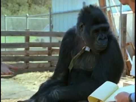 Была очень интересная горилла Коко, блестяще владевшая амсленом, и она показала, что у обезьян есть много того, о чем люди не подозревают. Во многих трудах описан следующий случай: была зима, горилла сидела в комнате, за окном на подоконнике кто-то насыпал крошек. Коко смотрела, как птицы их ели. Зашел экспериментатор и жестами показал, что пора идти есть. Коко без улыбки жестами отвечает: