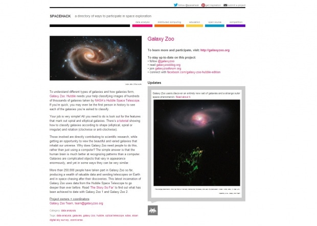 Космос – это олицетворение будущего, хранилище тайн и загадок. Интернет сокращает расстояние между людьми и звездами, предоставляет пользователям возможность принять участие в масштабных исследованиях и внести свой вклад в развитие научной мысли. Подобная модель сотрудничества выгодна для обеих сторон: ученые пополняют базы данных, пока участники расшифровывают снимки их космоса и обогащают свои знания. Примеров краудсорсинговых научных проектов много, но большинство из них пропадают на безликих государственных сайтах и в пучине Интернета. Площадка «Spacehack» создана для того, чтобы объединить существующие проекты и предоставить пользователю простой способ приобщиться к любому из них.