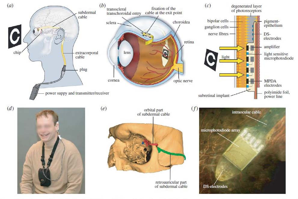 Имплантация матрицы в организм пациента Если мозг справился с такими изменениями в получаемой от органов зрения информации, то, возможно, он научится обрабатывать и информацию другого рода. Это было проверено в ходе исследования тюбингенских ученых, которые попытались помочь больным с наследственной дистрофией сетчатки. У этих людей перестают работать светочувствительные клетки: те самые колбочки и палочки, и в результате человек слепнет. Ученые решили стимулировать электричеством клетки предыдущего слоя сетчатки, которые обычно не дают нервных импульсов в ответ на свет. Трем добровольцам на заднюю поверхность глаза имплантировали матрицу из стимулирующих электродов, соединенную объективом. В результате люди смогли видеть: они научились отличать контуры предметов на столе, различать геометрические узоры и крупные буквы, даже пройти по комнате.