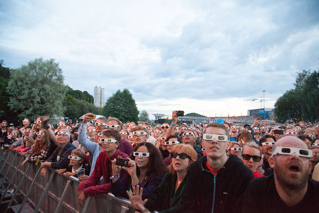 © Steffen Rikenberg / Øya Festival Самым эффектным концертом Øya Festival лично для меня стало 3D-шоу Kraftwerk. И не только потому, что это развлечение сродни посещению кинотеатра Imax — когда ты в бумажных очках стоишь в чистом поле, а на тебя под песню «Space Lab» налетает орбитальная станция, хочется кричать от восторга вместе с соседями. Больше всего изумляет способность этого немецкого предприятия, в котором трудится неизвестное число сотрудников под руководством незаменимого Ральфа Хюттера, модернизироваться, оставаясь неизменным и подчеркнуто традиционалистским по форме. Kraftwerk уже зарезервировано место в истории. Они всячески подчеркивают, что их знаменитые песни — это музейные объекты, которые они при этом постоянно реконструируют, обновляя саунд и украшая дополнительными эффектами. Теперь трехмерным видео, а что будет дальше?