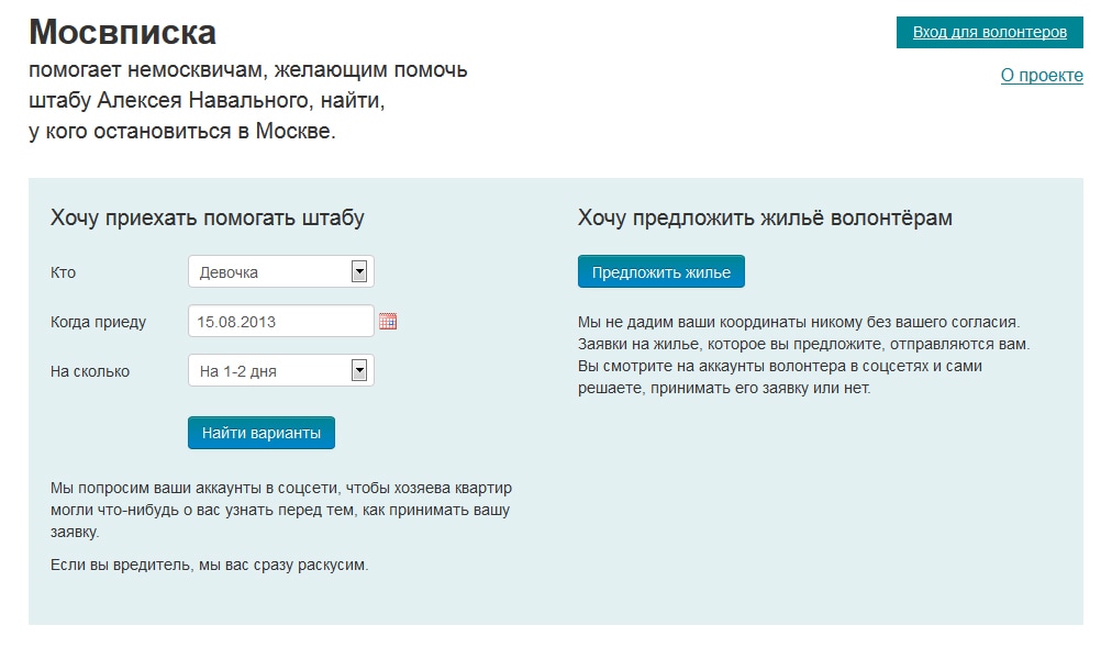 Сайт «Мосвписка» помогает немосквичам, желающим поддержать Алексея Навального в его избирательной кампании, найти у кого остановиться в Москве.