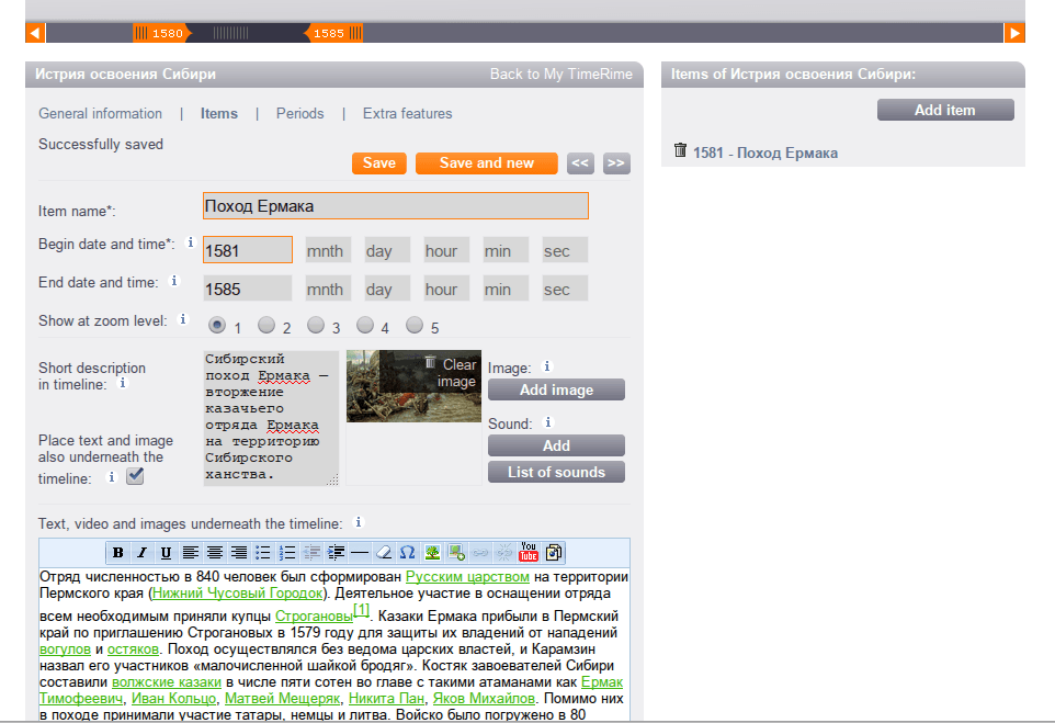 Когда работа над этим элементом хронологической ленты закончена, можно нажать на кнопку Save and New, что сохранит текущий слайд и откроет форму для создания нового. Таким образом, вы можете добавить на ленту времени все события, необходимые для иллюстрации темы вашей статьи или презентации. На полотне ленты они отображаются в виде небольших изображений или облачков с коротким описанием, а после щелчка по ним снизу появляется дополнительная информация.