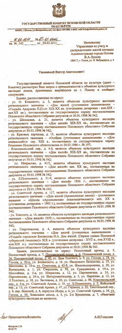 Не прошло и года с момента утверждения Списка выявленных объектов культурного наследия, когда комитет по культуре, в очередной раз возглавленный А. И. Голышевым [ 2], начал писать в разные организации (включая Росимущество!) письма о том, что здания, включенные в Список как выявленные объекты культурного наследия, таковыми не являются.
