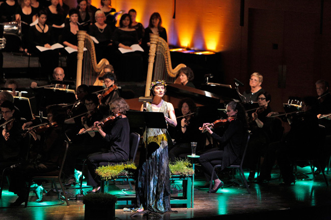 © Bard music festival Леон Ботстайн дирижирует Американским симфоническим оркестром, Sosnoff Theater Античная арка к «Орестее» была переброшена в последней программе фестиваля, которая стала его кульминацией. Хрупкая, невесомая музыка мелодрамы «Персефона» соседствовала в ней с мощной, экспрессивной оперой-ораторией «Царь Эдип». Почти никаких декораций — только трон, покрытый живой травой, на который присаживалась Персефона (чтица Джин Стилвел). Супратитры стали сценографическим элементом, превратившись в минималистичный видеоряд с текстом, напоминающий облако тегов.