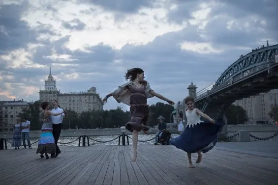 «Хотите еще вальса?» — «Да!» — и танцоры вновь рассыпаются парами по дощатой Пушкинской набережной. А мама с дочкой просто так — без пары, в юбках солнце-клеш — скачут между ними. Чуть подальше страстно танцуют хастл. Из-под облаков любуются на все это безбашенные люди, свесив ноги с перекрытия Пушкинского моста (разморенные духотой летнего вечера охранники добродушно не обращают на них внимания)