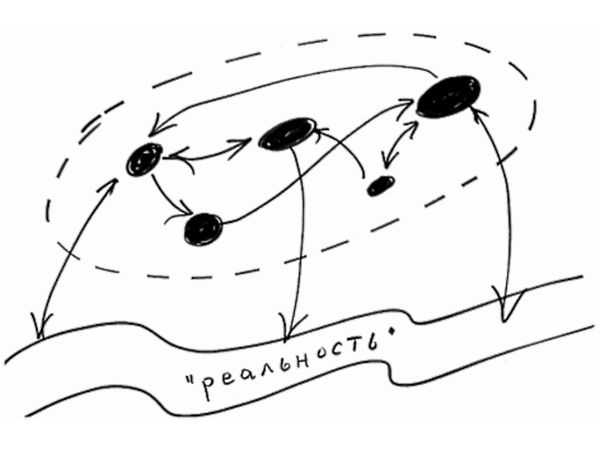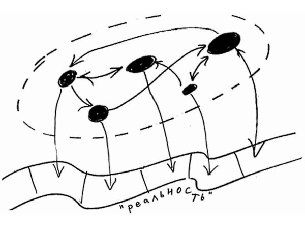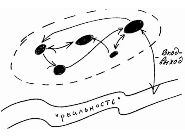 Вход и выход обобщенной машины – это как раз ее связи с «реальностью». Они могут быть устроены очень по-разному. Вход и выход в «реальность» может монопольно принадлежать какому-то одному или нескольким элементам машины (как это было, скажем, в сети NETtalk). Или же, напротив, все элементы машины могут иметь одинаковую возможность взаимодействовать с «реальностью» без какого бы то ни было ограничения. Наконец, возможна конфигурация, когда каждому человеку или группе людей из данного социума может быть выделена некоторая часть «реальности» - их «территория» - взаимодействовать с которой позволено только им.