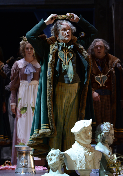 Хорошо, что у Зальцбурга теперь есть режиссер Стефан Херхайм. В его версии «Мейстерзингеры» выглядят не так страшно. Это просто детская забава, причем в буквальном смысле слова. Декорации (художник Хайке Шеле) изображают квартиру немецкого буржуа эпохи бидермайера (правда, много книг). В правом углу сцены — детская комната. Ей предстоит сыграть решающую роль в спектакле, ведь мебель, начиная с обычного секретера, вдруг увеличивается в размерах и достигает непривычных габаритов. Фейт Погнер (Георг Цепенфельд) и Ганс Сакс (Михаэль Фолле) живут в таких супершкафах, различающихся так же, как их доходы: у одного — нарядный буфет из махагони с цветами, у другого — рабочего вида пространство для обуви. В итоге финальные хоры поются уже на стеллажах, занимающих весь левый угол сцены. На переднем плане — бюсты Гете, Бетховена и самого Вагнера. Самый большой, с венком, изображает Шопенгауэра.