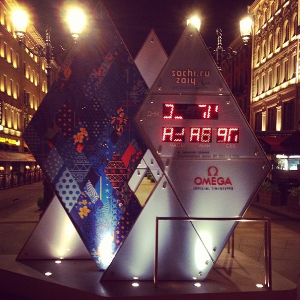 Часы на углу Невского проспекта, отсчитывающие дни до начала зимней Олимпиады в Сочи, сломались. Вместо цифр на кварцевом циферблате отображаются непонятные значки. Часы обратного отсчета установили на Малой Конюшенной улице в феврале этого года, ровно за год до Олимпийских игр, — их торжественно открыл губернатор Полтавченко. UPD: неполадку устранили. Специалисты компании OMEGA заменили неработающий элемент дисплея и перезапустили механизм.
