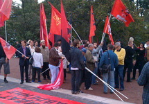 В Москве на Суворовской площади состоялся согласованный митинг за бойкот выборов мэра столицы, сообщает корреспондент "Граней". Собравшиеся вышли под лозунгом "Против Путина и Навального". В митинге приняли участие около 50 человек - это активисты "Другой России", Левого фронта, РОТ фронта, РКСМ(б), Группы коммунистов-максималистов, а также анархисты.