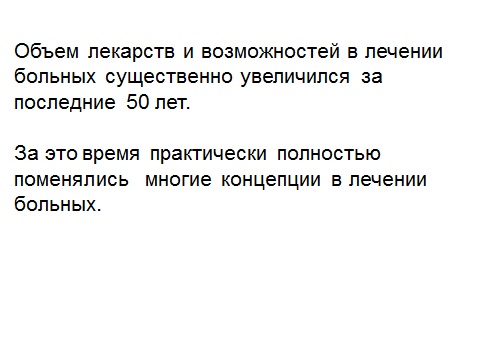 Итак, первый тезис достаточно известен и не подлежит сомнению, - что объем лекарств резко увеличился за последние 50 лет, и удивительно, что изменились многие концепции, практически все концепции в лечении больных.