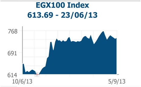 Аналогичная тенденция наблюдалась и с другими египетскими биржевыми индексами. Скажем, египетский EGX 100,начав рост уже с 23 июня 2013 года с отметки в 613,69, вырос к закрытию биржи накануне переворота почти на 10% (до 671,26), а после переворота, 4 июля подскочил до 728,91(так что общий рост за период 23 июня – 4 июля составил около 19%) (Рис. 2).
