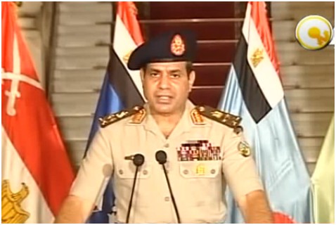 Министр обороны Египта Абд ал-Фаттах ас-Сиси выступает с обращением к гражданам заявил об отстранении президента Мухаммеда Мурси от занимаемой им должности и приостановлении действия принятой в декабре 2012 года конституции. Источник: https://upload.wikimedia.org/wikipedia/en/3/3e/General_Al-Sisi%2C_announcing_the_removal_of_President_Morsi.png