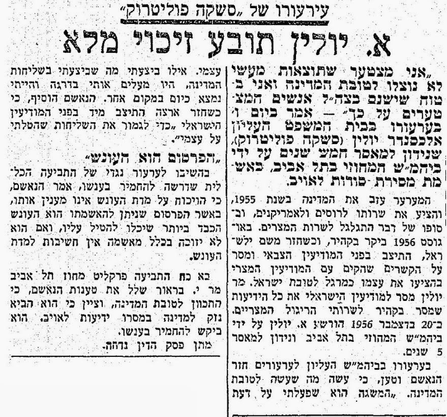 В 1955 году решил вернуться к своей первой профессии - журналиста. Хотел поехать в СССР, найти свою дочь... Где-то полгода были пертурбации по всей Европе: сначала Иолин обращался в советское посольство, потом в американское, а в итоге оказался в Египетском. По приезду в Израиль сразу пришёл к своему давешнему другу - Узи Наркису, всё как есть ему рассказал... Сказал, что хочет быть двойным агентом... У Наркиса, который тогда служил в ГенШтабе, не было выбора - на Иолина одели наручники прямо в его офисе...
