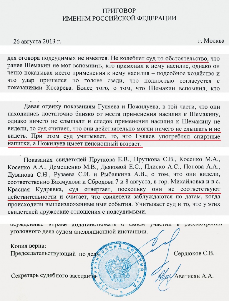 За основу суд взял показания Шемакина и свидетеля Косарева, поскольку они «последовательны, согласуются между собой, непротиворечивы в основных и существенных деталях», есть, конечно, противоречия в показаниях и потерпевшего, и главного свидетеля, но они «не влияют на этот вывод суда». «То, что Шемакин просил сослуживцев подтвердить факт нахождения Сбродова и Бахмудова в воинской части, не может опровергнуть его показания... Те обстоятельства, что телефон, принадлежащий Шемакину, оказался у лиц, которые никакого отношения к воинской части не имеют, и что автомобиль, на котором вывозили Шемакина, не установлен, также не опровергают показания Косарева» (стилистика приговора сохранена). Показания свидетелей из Красной Кудрявки и Михайловки о том, что они видели подсудимых во время совершения преступления за 800 км от места его совершения, «суд отвергает, поскольку они не соответствуют действительности, и считает, что свидетели заблуждаются по датам». Суд отвергает, не принимает во внимание, показания не влияют на вывод суда... И вдруг: «Не колеблет суд то обстоятельство...» Так и сказал: не колеблет? Может, ослышались?