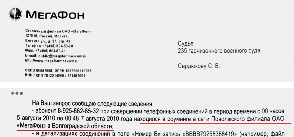 В ответ на запрос судьи Сердюкова директор по безопасности «Мегафона» подтвердил: номер Бахмудова был в роуминге в Волгоградской области