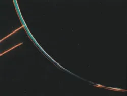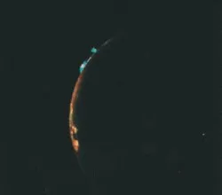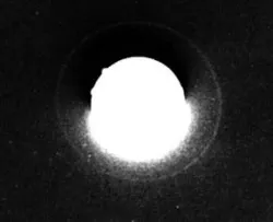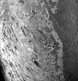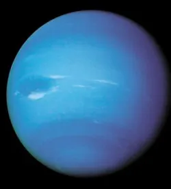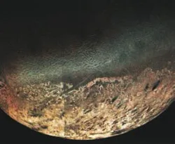 1989 — Нептун (рис. 14). Эта планета тоже подарила много сюрпризов. «Вояджер» подтвердил существование колец Нептуна и сделал их фотографии (рис. 15). Открыл шесть новых спутников Нептуна и тщательно изучил крупнейший спутник Тритон (рис. 16), на котором обнаружились удивительные криовулканы (рис. 17-темные пятна на фото, как полагают, следы вулканов).