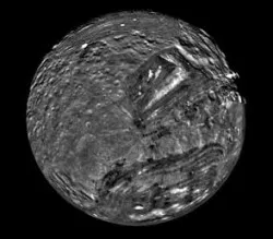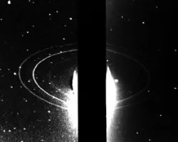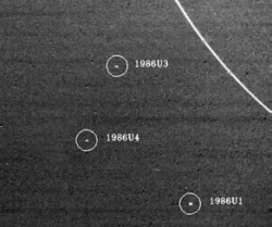 1986 год — Уран. «Вояджер-2» пока что остается (и в обозримом будущем и останется) единственным аппаратом, побывавшим в окрестностях Урана и Нептуна. Поэтому, разумеется, научная ценность данных аппарата огромна. Впервые была получена качественная фотография колец Урана (рис.10) , заодно открыто два новых кольца. Сфотографированы крупные спутники, например Оберон (рис. 11) и Миранда (рис.12). Миранда заодно удивила астрономов своим неожиданно сложным рельефом. Также открыто 11 новых спутников (рис. 13).