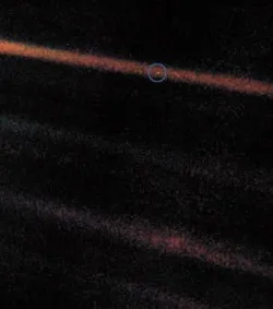 Но на этом поток фотографий не иссяк. В 1990 году «Вояджер-1» сделал удивительный снимок, который вошел в историю как «Семейный портрет». Из нескольких десятков кадров удалось собрать групповой портрет Солнечной системы с расстояния в 40 астрономических единиц от Земли. Меркурий и Марс оказались засвечены, но остальные планеты получились. И на одном из кадров этой мозаики — «тусклая голубая точка». Именно такое название получил снимок Земли с расстояния 6 миллиардов километров (рис. 18).