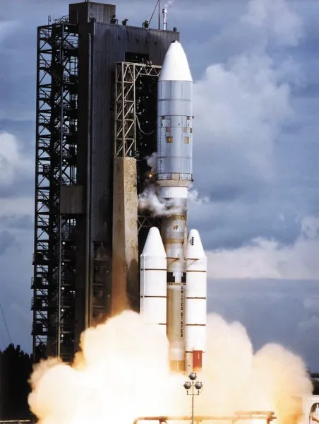 1977 год — запуск экспедиции состоялся в конце августа — начале сентября. При этом первым стартовал «Вояджер-2» — 20 августа ракета-носитель «Титан-IIIE» c разгонным блоком «Центавр» отправила в космос «Вояджер-2» (рис. 2). «Вояджер-1» стартовал 5 сентября. Он изначально летел только к двум планетам — Юпитеру и Сатурну, поэтому летел по менее экономичной, но более короткой трассе. К слову, аппараты несли на борту не только научное оборудование, но и золотой диск с посланием к внеземным цивилизациям (рис. 3).