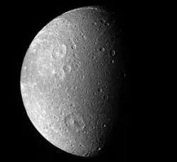 1980-1981 годы — Сатурн. Здесь аппараты разделились — «Вояджер-1» ушел вверх над плоскостью Солнечной системы, где нет планет, и свои уникальные снимки он сделает позже. «Вояджер-2» по более сложной траектории ушел к Урану и Нептуну. Про Сатурн тоже удалось узнать много — и сейчас эти снимки выглядят не так эффектно только потому, что уже 9 лет на орбите Сатурна работает «Кассини». Однако открыли сложную структуру колец Сатурна (рис. 8), сфотографировали близко многие его спутники (рис. 9 — Диона) и открыли восемь новых спутников Сатурна именно «Вояджеры».