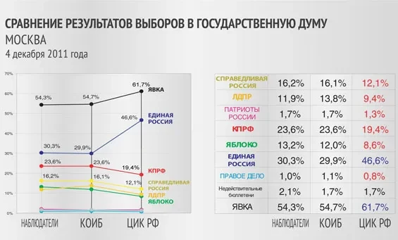 К тому же в день московского голосования 4 декабря 2011 года известный социологический Центр ФОМ опубликовал данные экзит-полла, согласно которым ЕР набрала лишь 27%. Весьма похоже на правду, ибо ни наблюдатели, ни КОИБы не гарантируют на своих выборках полной защиты от фальсификата. Они лишь сужают возможности его применения.