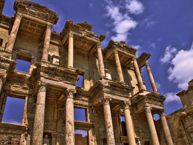 Еще один пример - надпись на знаменитой библиотеке Цельса. Посвятительная надпись на греческом языке проходит поперек грандиозного фасада здания. Однако она разбита четырьмя портиками, так что текст на выступающих частях оказывается хорошо виден, и информация на нем естественным образом выглядит более значимой. Акцент делается на именах: кому и кто посвятил, кто руководил строительством. Остальная часть надписи (титулы, описание здания как библиотеки, связочные глаголы) находится в выемках в тени.