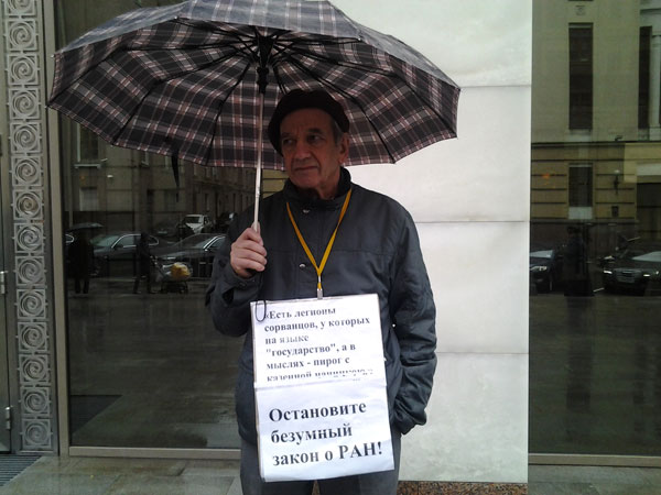 «Это же глупый закон, и откуда он идет понятно, уж не из этого дома, – сказал географ Юрий Мачерет, стоявший в пикете, когда Фортов шел на встречу с Матвиенко. – Наука в подвешенном состоянии. Нас как при крепостном праве приписали к какой-то собственности и продают ‘вместе с крестьянами’».